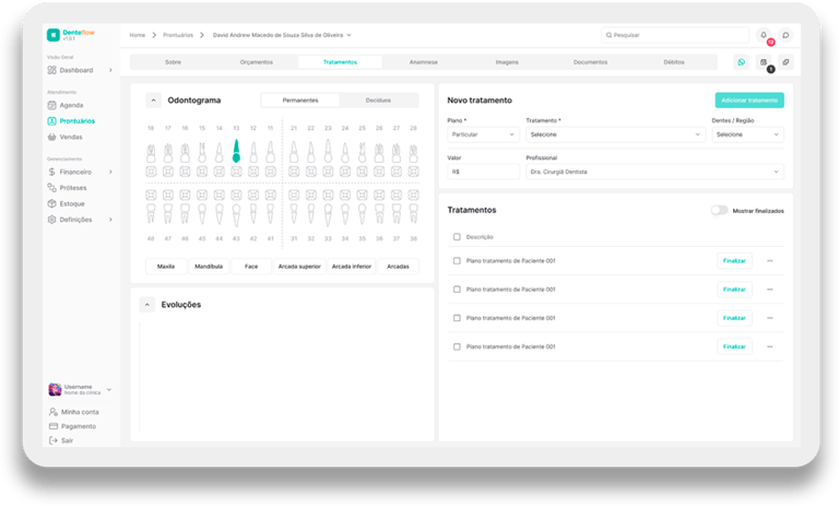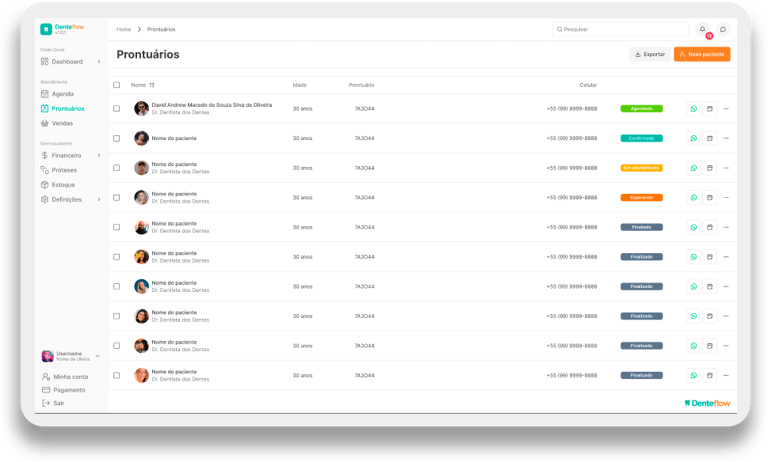 Diga adeus às pilhas de papéis e às fichas perdidas. Com o Prontuário Digital da Denteflow, todas as informações dos seus pacientes ficam armazenadas de forma segura e acessível com apenas alguns cliques.